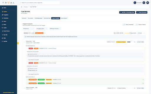 Impact Analysis in Tryal Accelerator represents a fundamental shift in how clinical document management works. It moves the industry from a model where every change triggers a manual, error-prone review across dozens of documents to one where the system itself understands what changed, what it affects, and guides the user through resolution.